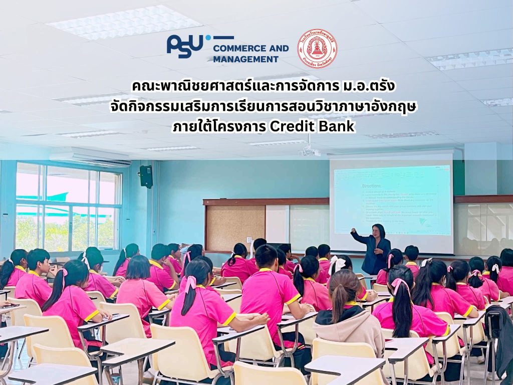 คณะพาณิชยศาสตร์และการจัดการ มหาวิทยาลัยสงขลานครินทร์ วิทยาเขตตรัง โดยคณาจารย์สาขาวิชาภาษาอังกฤษธุรกิจ จัดกิจกรรมเสริมการเรียนการสอนวิชาภาษาอังกฤษ ภายใต้โครงการ Credit Bank ภาคการศึกษาที่ 1/2568 เมื่อวันเสาร์ที่ 4 ตุลาคม 2568 ณ ห้องบรรยาย L1312 และ L1315 อาคารเรียนรวม 1
